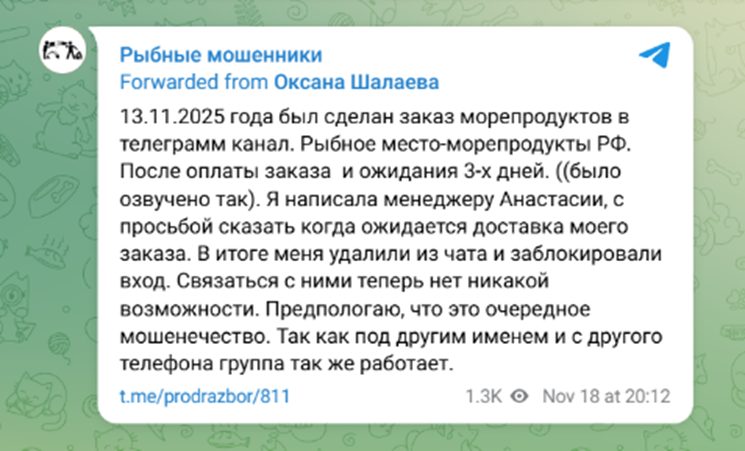 На канале в Телеграме «Рыбное Место» с морепродуктами РФ предлагают совершить платеж. Затем аккаунт покупателя блокируется, поэтому нет возможности получить заказ и вернуть деньги. Такой принцип работы – признак мошенничества, когда администратор забирает средства, а все обращения клиента остаются без ответа.