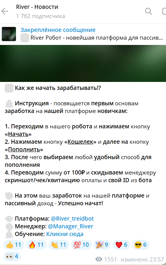 ТГ-бот «River Робот» не внушает доверия. По схеме заработка он похож на финансовую пирамиду. Клиенты вносят депозиты, привлекают других людей и получают ежедневные выплаты. Проект действительно может платить, но только до тех пор, пока приходят новые участники и вносят свои депозиты. Собственных финансовых резервов у таких сервисов нет.