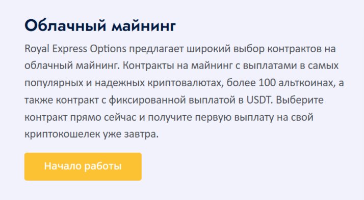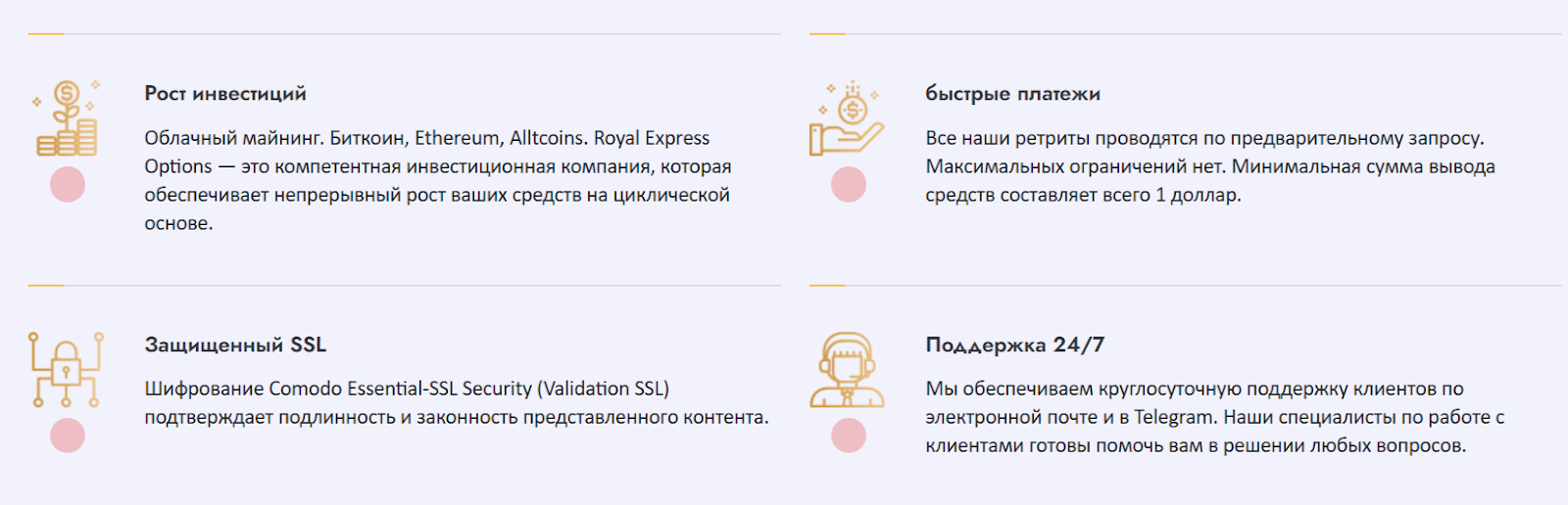 - Информации о тарифных планах и условиях сотрудничества с Royal Express Options на веб-странице нет. Как правило, так поступают недобросовестные основатели ресурсов.