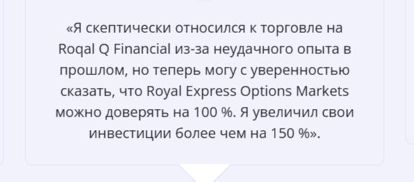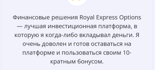 На сайте Royal Express Options опубликованы отклики довольных клиентов платформы. Люди называют площадку лучшей, пишут, что готовы и дальше с ней сотрудничать и использовать бонусы.