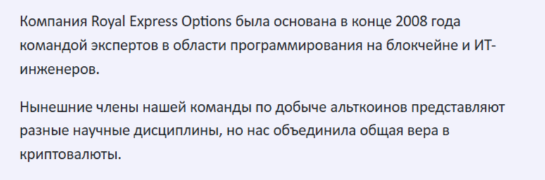 Офис компании-основательницы ресурса, якобы, находится в Нью-Йорке, на бульваре Санта-Моника. На веб-странице прописано, что Royal Express Options была образована в 2008 году, более 15 лет успешно занимает свою нишу.