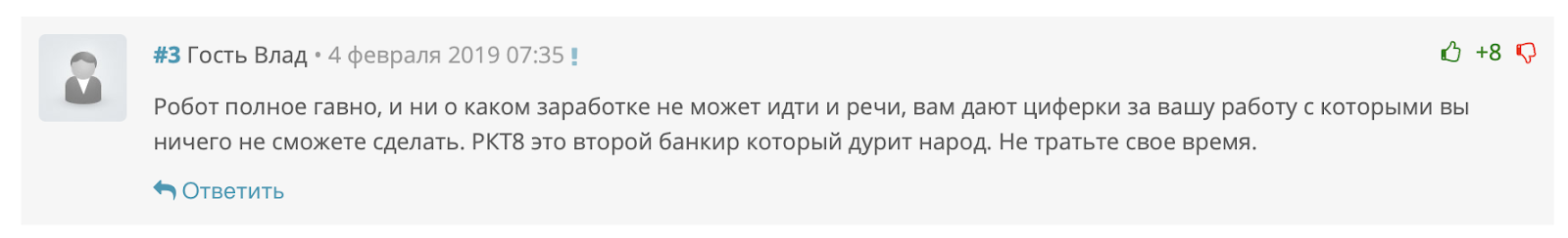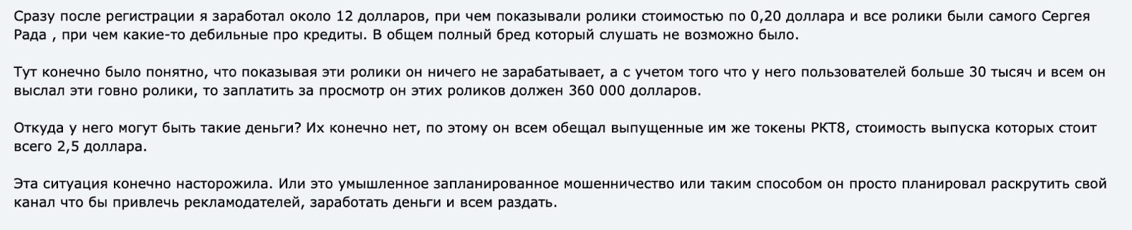 Многие отмечали, что Robot RKT8 — телеграм бот, позволявший немного заработать только на самых первых этапах, пока проект был новым и активно раздавал токены. Обычные пользователи, которые честно работали без сотен рефералов, быстро упирались в стену — накопленные токены обесценивались или просто становились недоступны для вывода. Часто звучали слова «лохотрон», «скам» и прямые обвинения в адрес создателя.