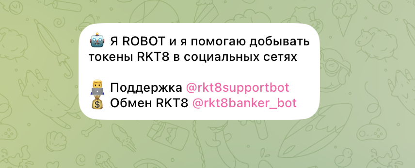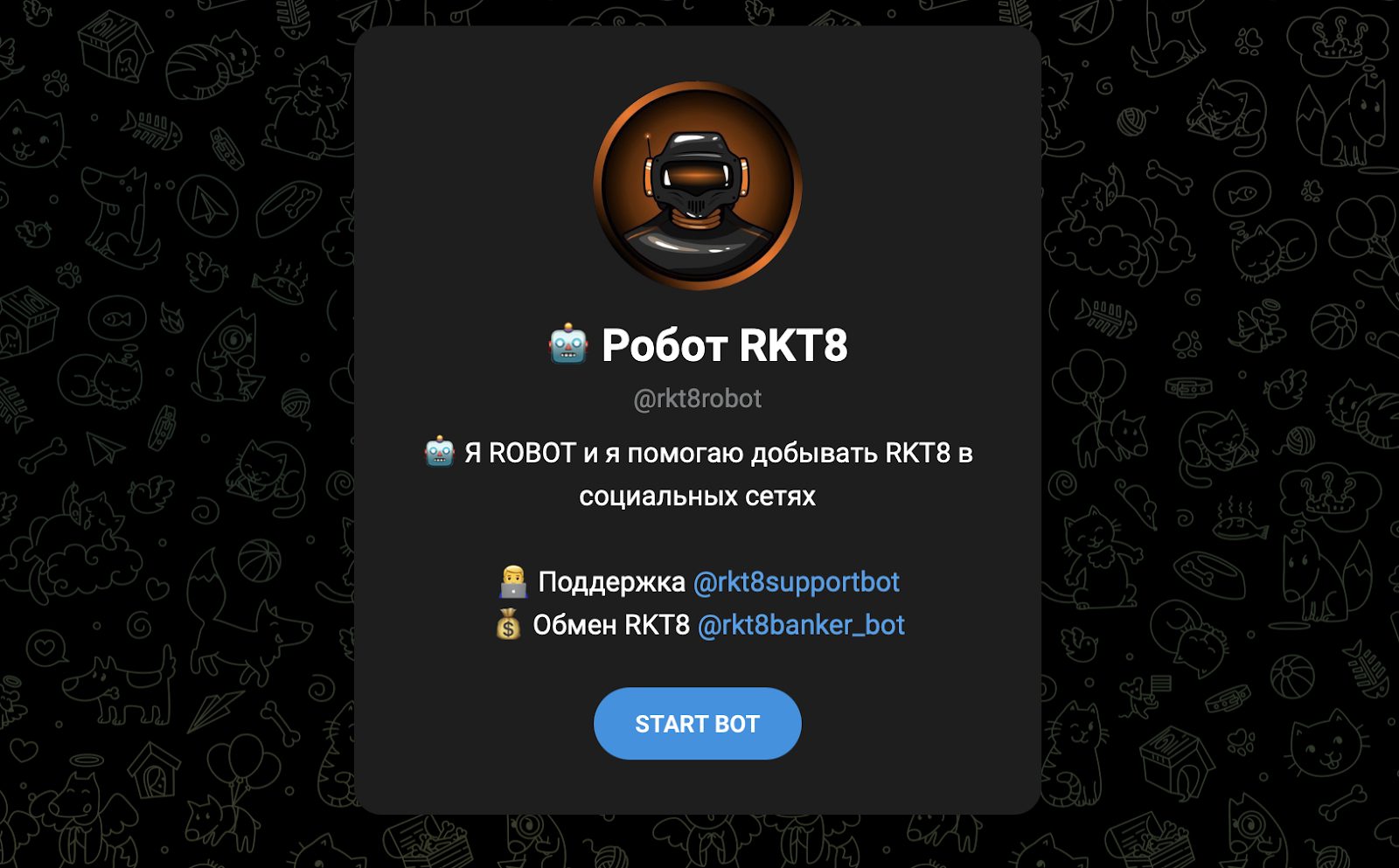Робот RKT8 — телеграм-бот, по условиям которого вы могли получать крипту RKT8 за самые незатратные задания: серфинг в соцсетях, лайки, комменты под публикациями и подписки в популярных социальных сетях.