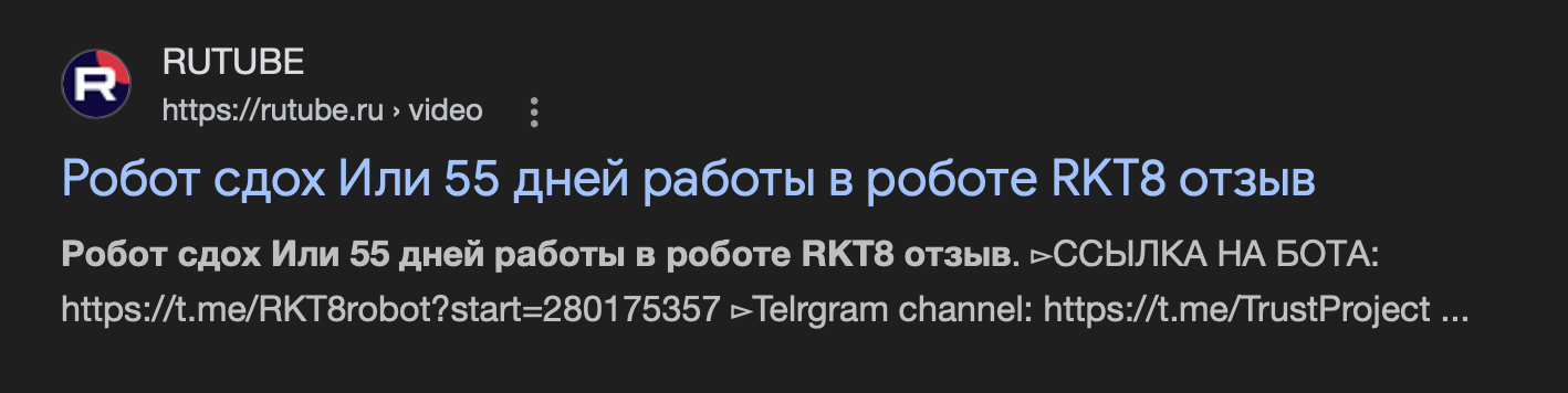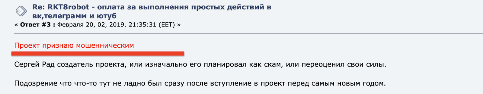 Robot RKT8 — телеграм бот, который быстро приобрел статус «мошеннического» на многих форумах и в отзывах. Бот до сих пор существует, но активность в нем практически нулевая. Никаких новых обновлений, обещанных версий 2.0 и 3.0 за все эти годы так и не вышло.