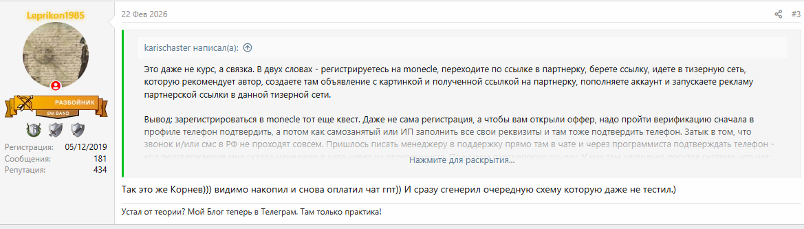 Благодаря комментаторам на форумах довольно легко узнать, в чем здесь подвох. Один из юзеров написал довольно развернутый отзыв. Он утверждает, что суть схемы в рекламе партнерской ссылки, за переходы по которой и выплачиваются деньги. Вот только нюансов очень много: как минимум регистрация в рекомендуемой сети очень сложная: требует верификаций и SMS-потдверждений, которые не приходят россиянам. Кроме того, рекомендуемый “экспертом” источник трафика – очень сомнительный.
