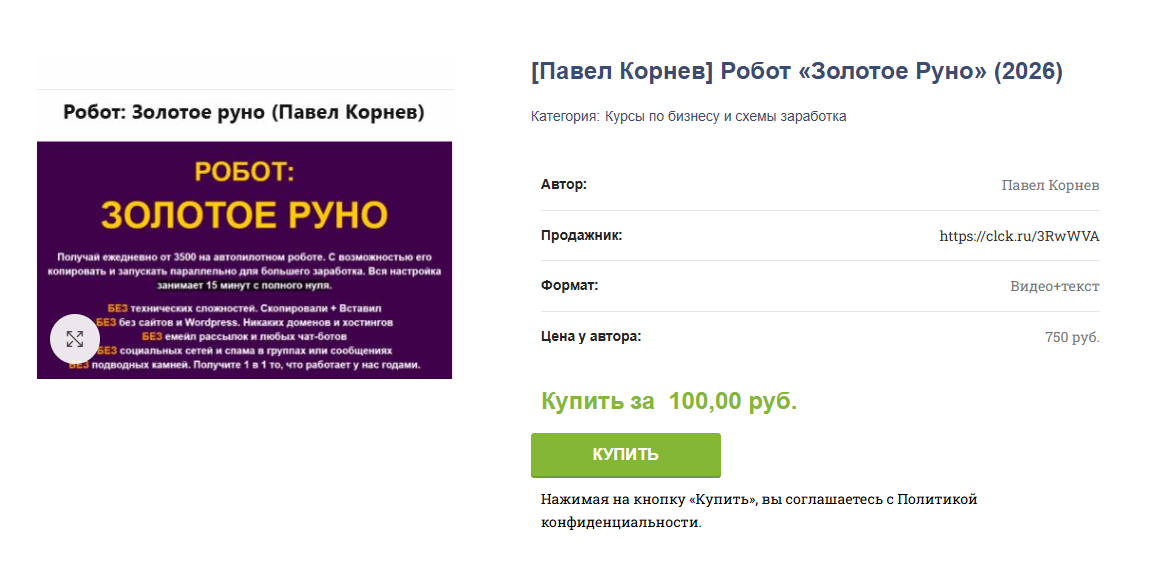 Павел Корнев Робот Золотое руно 2026 – это курс по пассивному заработку в интернете от 3,5 тысяч рублей в день с полного нуля. Схема якобы является масштабируемой, а значит, доход может быть в разы выше. Автор, по сути, предлагает готовую связку и заявляет о ее предельной простоте, однако ее низкая стоимость и громкие обещания вызывают серьезные сомнения. Мы проверим, что именно за способ предлагает ментор и сделаем выводы насчет его эффективности.