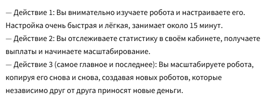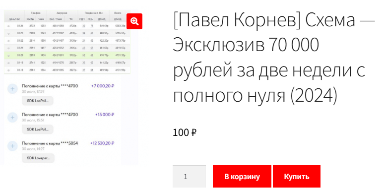 Подробного описания содержания нет. Но по утверждениям Павла, в день можно получать от 5 до 10 выплат, каждая из которых среднем составляет от 500–5000 рублей. При этом для реализации схемы достаточно буквально 15 минут, а все остальное время якобы занимает масштабирование.