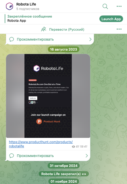 На 10 апреля 2026-го года на телеграмм-канал Robota Life остаются подписаны 5 пользователей. Публикации в его ленте получали по 50-70 просмотров. Реакций и комментариев посты не заслуживали.
