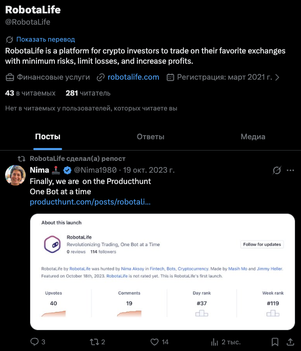 Интерес к странице RobotaLife в Twitter тоже являлся низким. На нее подписан 281 читатель. Страница давно заброшена.