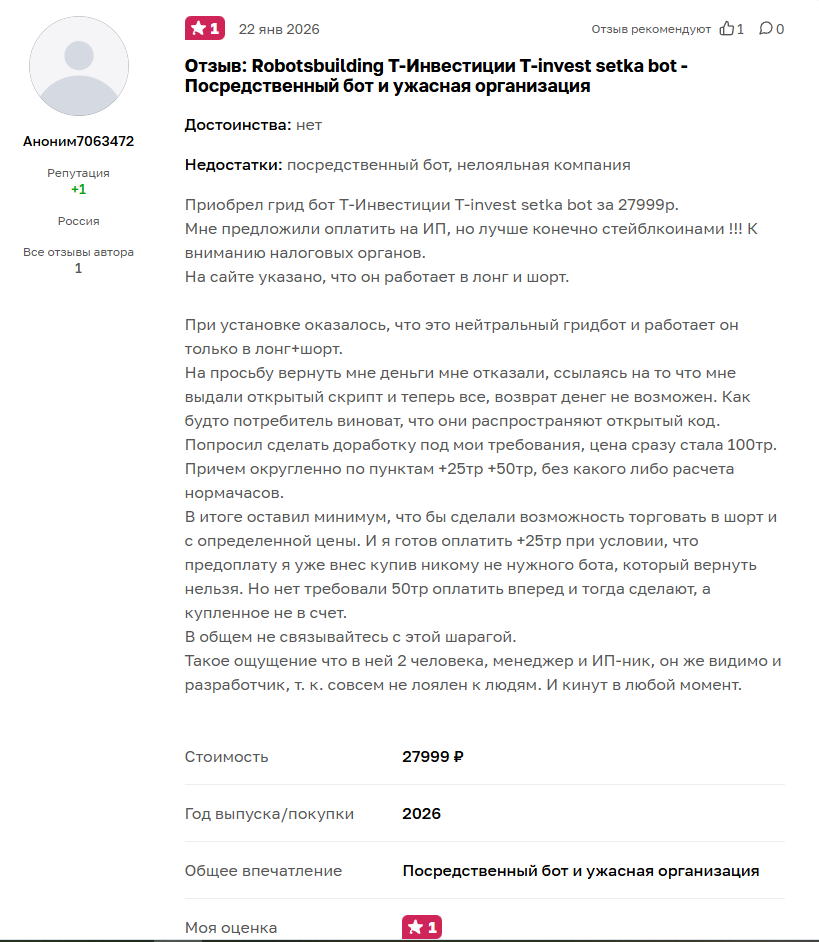 В одном из отзывов описывается ситуация с приобретением бота для платформы Т-Инвестиции стоимостью 27 999 рублей, после установки которого выяснилось, что программный продукт является нейтральным грид-ботом без поддержки полноценного разделения логики лонг и шорт, несмотря на заявления на сайте.