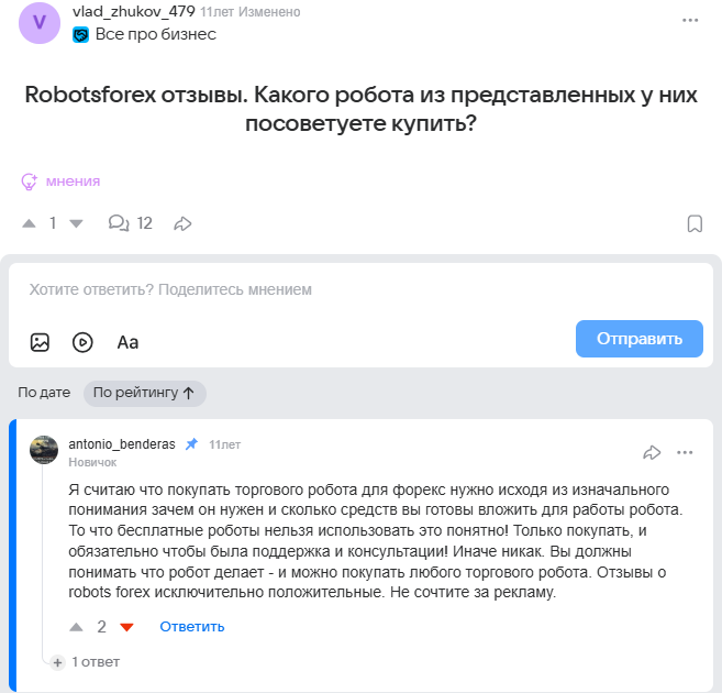 Репутация коммерческого проекта достаточно интересная. Торговых роботов от «РоботсФорекс» практически не обсуждают, но на одном из сайтов мы нашли вопрос от пользователя – стоит сотрудничать с компанией или нет. Комментарий в этом обсуждении несколько. Первый ответ – положительный отзыв о Robots Forex, он же прямая рекомендация.