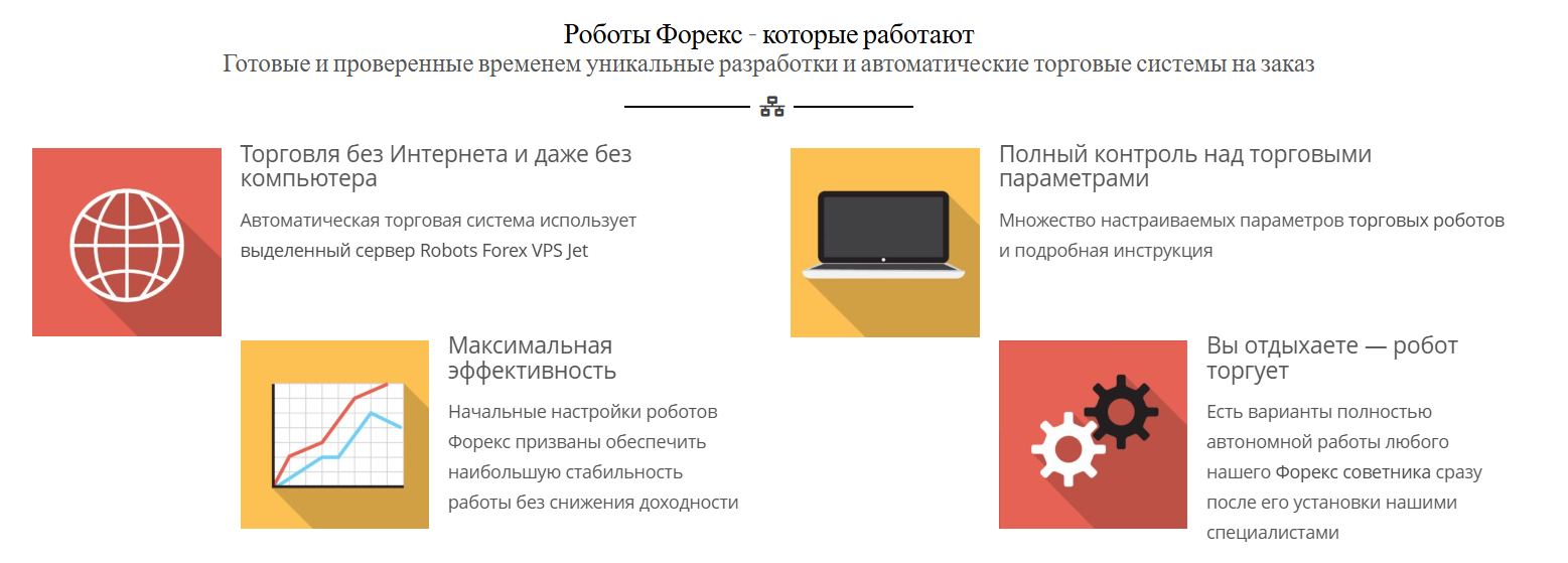 Основное направление деятельности компании – продажа Форекс-советников. Официальный сайт проекта демонстрирует главные преимущества сотрудничества: