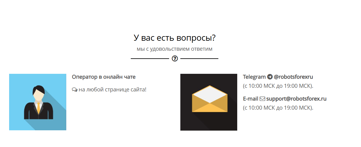 Связаться с саппортом можно по электронной почте или через Телеграмм. Техподдержка работает не круглосуточно, а с 10:00 до 19:00 по Мск. Соответственно, в другое время клиенты Robots Forex остаются без квалифицированной поддержки.