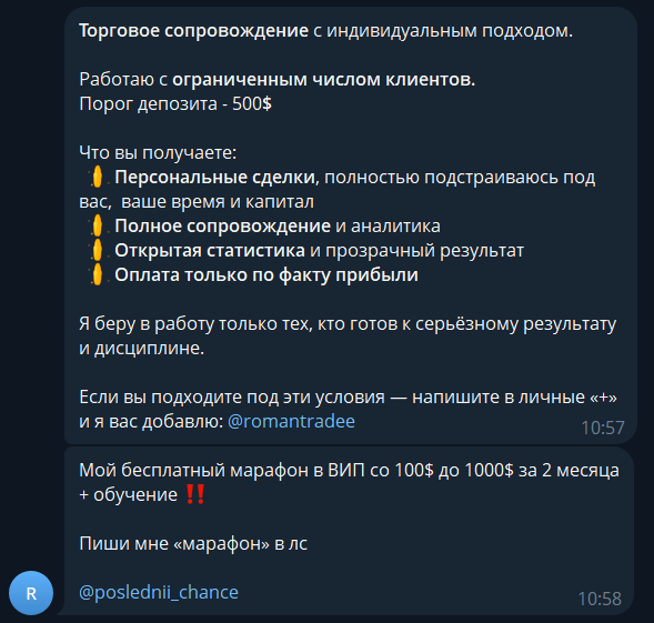 Рома Last Chance — трейдер из Телеграмма, который предлагает сигналы на условиях послеоплаты. Он торгует криптовалютой, проводит марафоны и приглашает подписчиков в свое закрытое сообщество. Рассмотрим, как работает Рома Last Chance и можно ли ему верить.