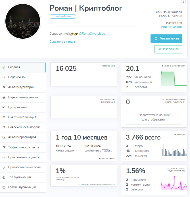 На начало декабря 2025 года у Романа есть телеграмм-канал под названием «Роман | Криптоблог» на чуть более 16 000 пользователей. По данным сервиса TGStat, площадка была зарегистрирована в феврале 2024 года. У проекта 1% аудитории, которая читает посты и проявляется активность. Вполне возможно, что Роман Антипов для своего криптоблога использовал накрутку.