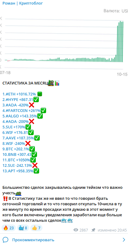 Для улучшения впечатления о себе трейдер регулярно показывал свою торговую статистику с конкретными активами, на которых удавалось зарабатывать. При этом нет никаких доказательств реальности этих цифр и процентов прибыли.