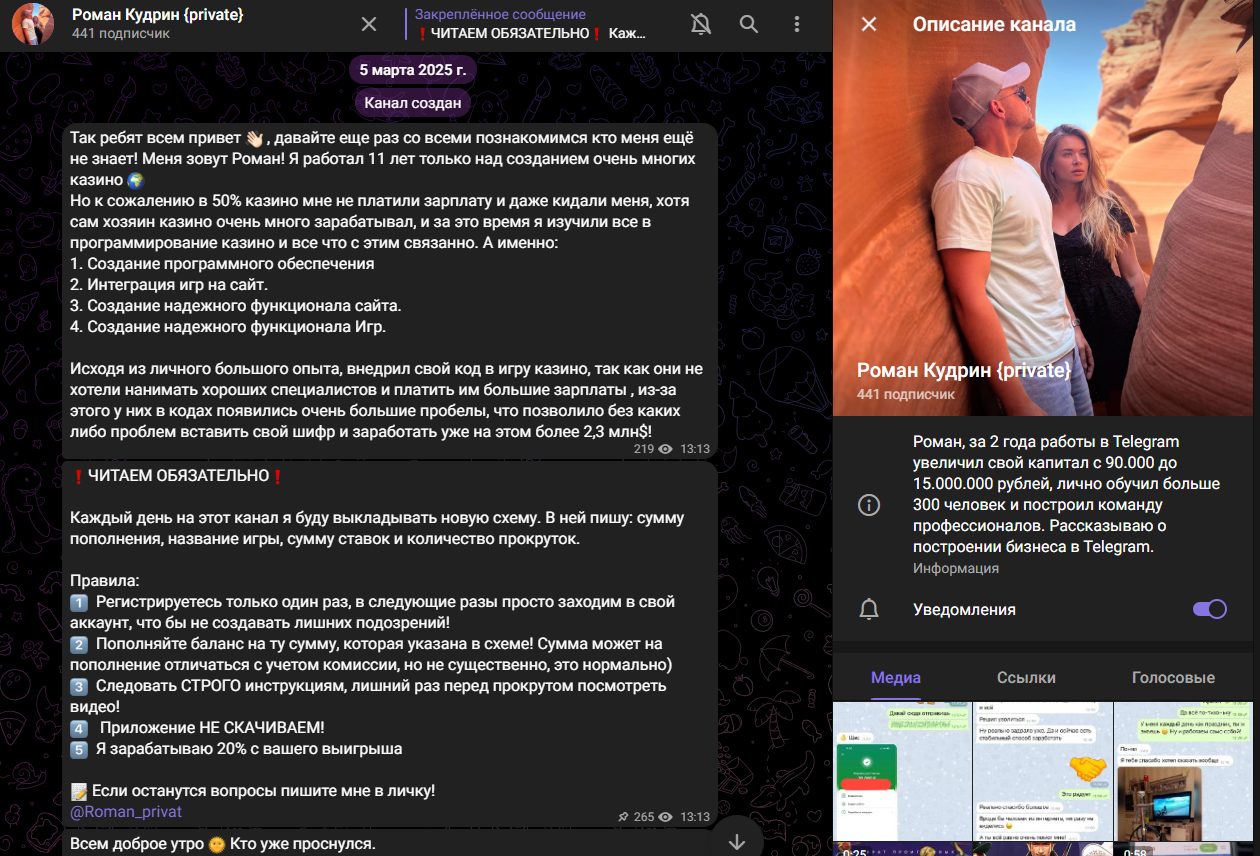 Телеграмм-канал «Роман Кудрин {private}» был зарегистрирован в мессенджере 5 марта 2025 года. Админ оставляет приветственный пост, причем обращается к аудитории так, как будто давно является успешным и узнаваемым инвестором – «давайте еще раз со всеми познакомимся, кто меня еще не знает».