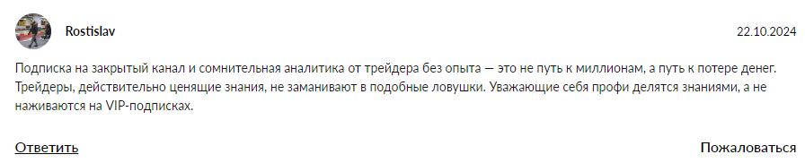 Другой пользователь в негативном отзыве утверждает, что уважающие себя трейдеры не заманивают людей в закрытые каналы так, как делает автор канала @RomanMishuk. Он считает, что основатель проекта наживается на VIP-подписках клиентов.