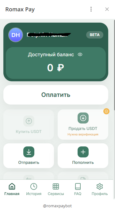 Это mini-app можно найти в поиске мессенджера так: romaxpaybot. При запуске бота открывается приложение с минималистичным интерфейсом: