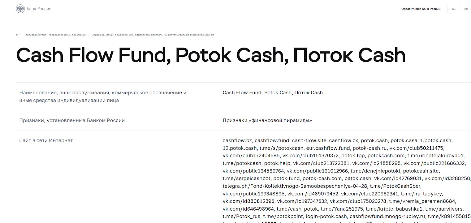 В Центробанке же считают по-другому: проект Cash Flow, Potok Cash и другие аналоги причислили к финансовым пирамидам. Вот соответствующая запись на сайте ЦБ РФ: