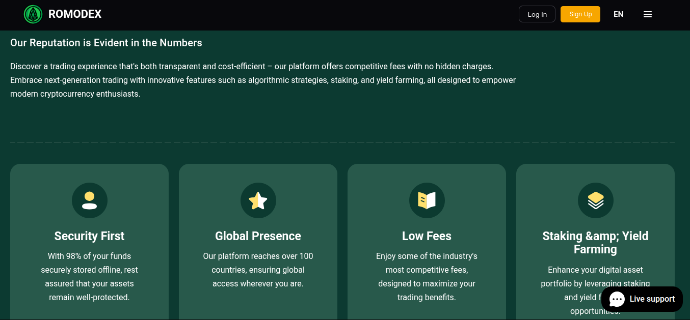 Одним списком преимуществ разработчики не отделались. Во втором блоке плюсов команда крипта биржи RomoDex com рассказала о повышенной защищенности. Большая часть активов пользователей размещена на «холодных» кошельках, благодаря чему доступ к ним злоумышленники получить не смогут.