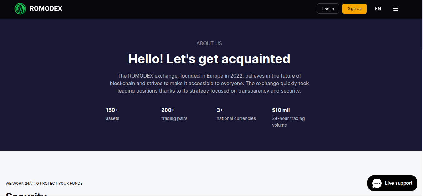Статистика, естественно, не подтверждена. В блоке About Us менеджеры утверждают про старт и лидерство в ЕС с 2022 год и мы это проверим. Кроме этого, разработчики написали про более 150 активов, свыше 200 торговых пар и более 3 национальных валют. Суточный объем торгов крипта биржи RomoDex com превышает 10 миллионов долларов.