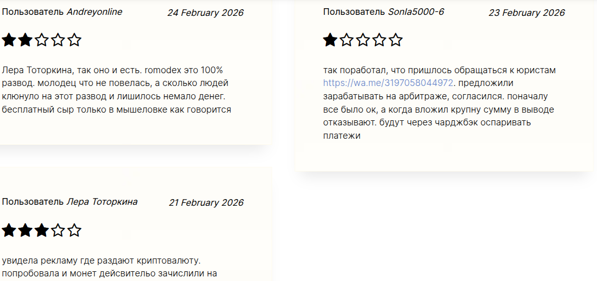 • Репутация у платформы крайне негативная. Отзывы о крипта бирже RomoDex com сугубо отрицательные с акцентом на трейд скам.