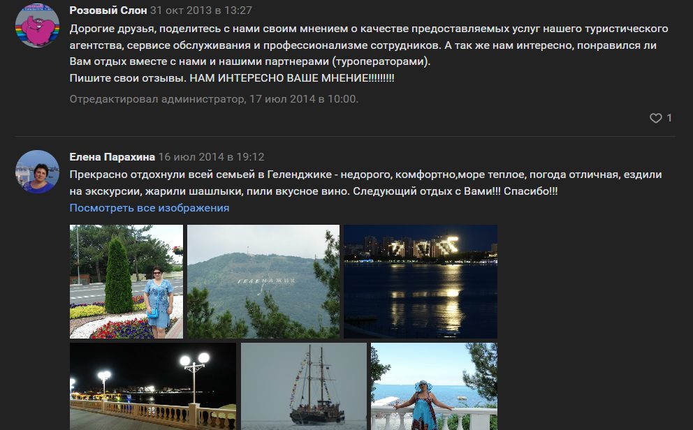 На ресурсах самого турагентства «Розовый Слон» есть много положительных отзывов о франшизах из разных городов. Пользователи делятся теплыми словами благодарности, восхваляют адекватные цены и обслуживание, а также прикрепляют фотоотчеты из мест отдыха.