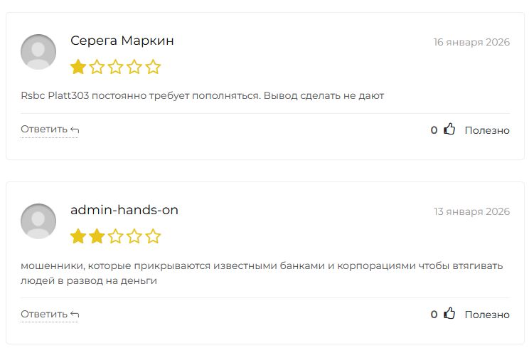 Как и ожидалось, в отзывах пользователи вовсю ругают брокера Rsbc platt303. Многие жалуются на давление со стороны менеджеров, требующих срочно пополнить баланс. Вывод средств блокируют под надуманными предлогами.
