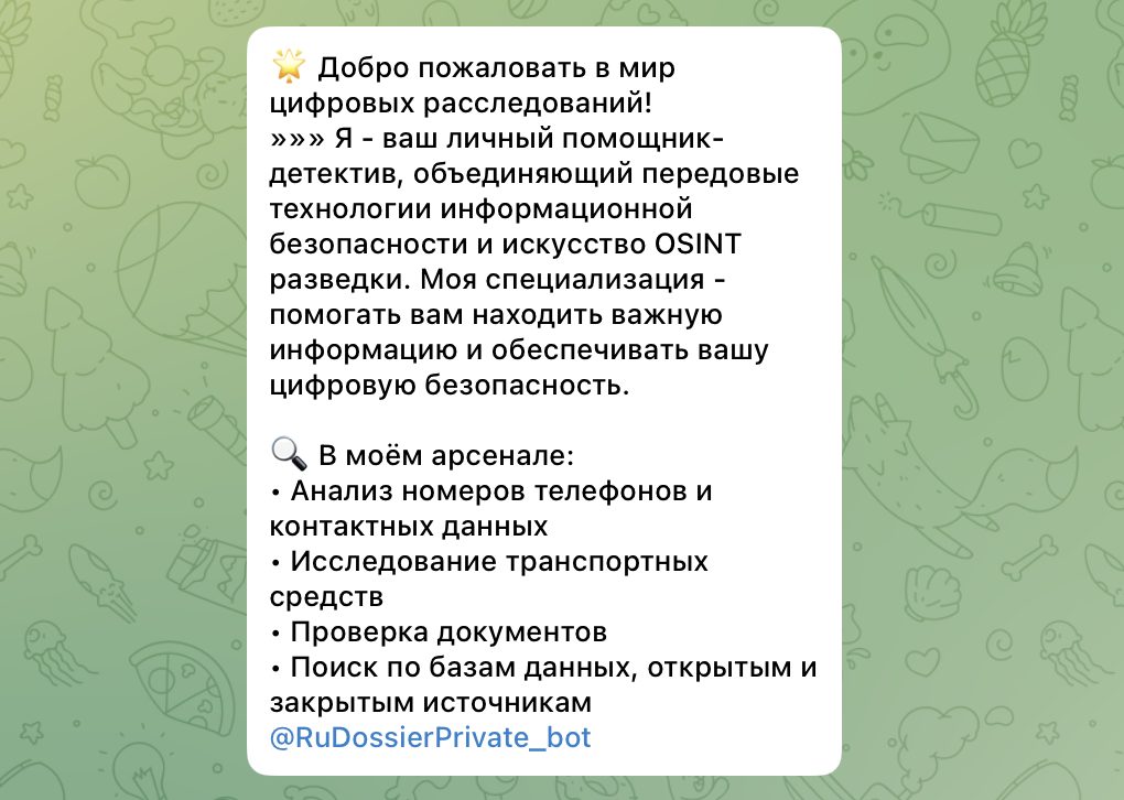 Основной функционал Ru Dossier в тг сводится к продаже досье на человека. Пользователю предлагается отправить данные цели, после чего бот рассчитывает стоимость и предлагает оплату. Заявленный результат — быстрый отчет с персональной информацией, который якобы собирается из различных источников.