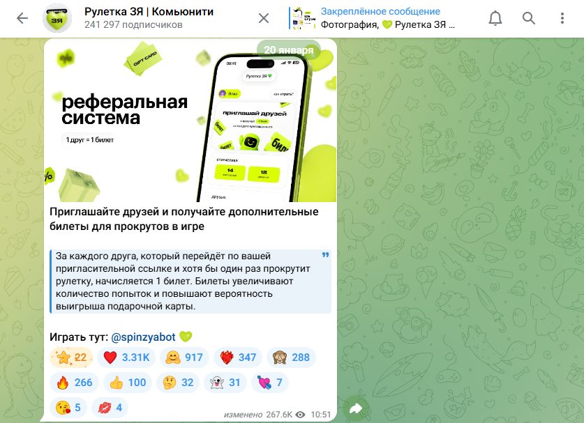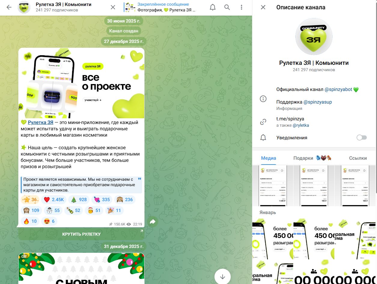 Телеграм канал “Рулетка ЗЯ | Комьюнити”, известный как Spinzya, имеет около 241 тысячи подписчиков, при этом в боте число пользователей якобы превышает 400 тысяч человек. Важный минус — закрытые комментарии к постам, это лишает возможности увидеть реальные оценки клиентов и задать вопросы. Просмотры огромные, от 40 до 300 тысяч, но при такой аудитории это выглядит аномально, вероятно это накрутка.