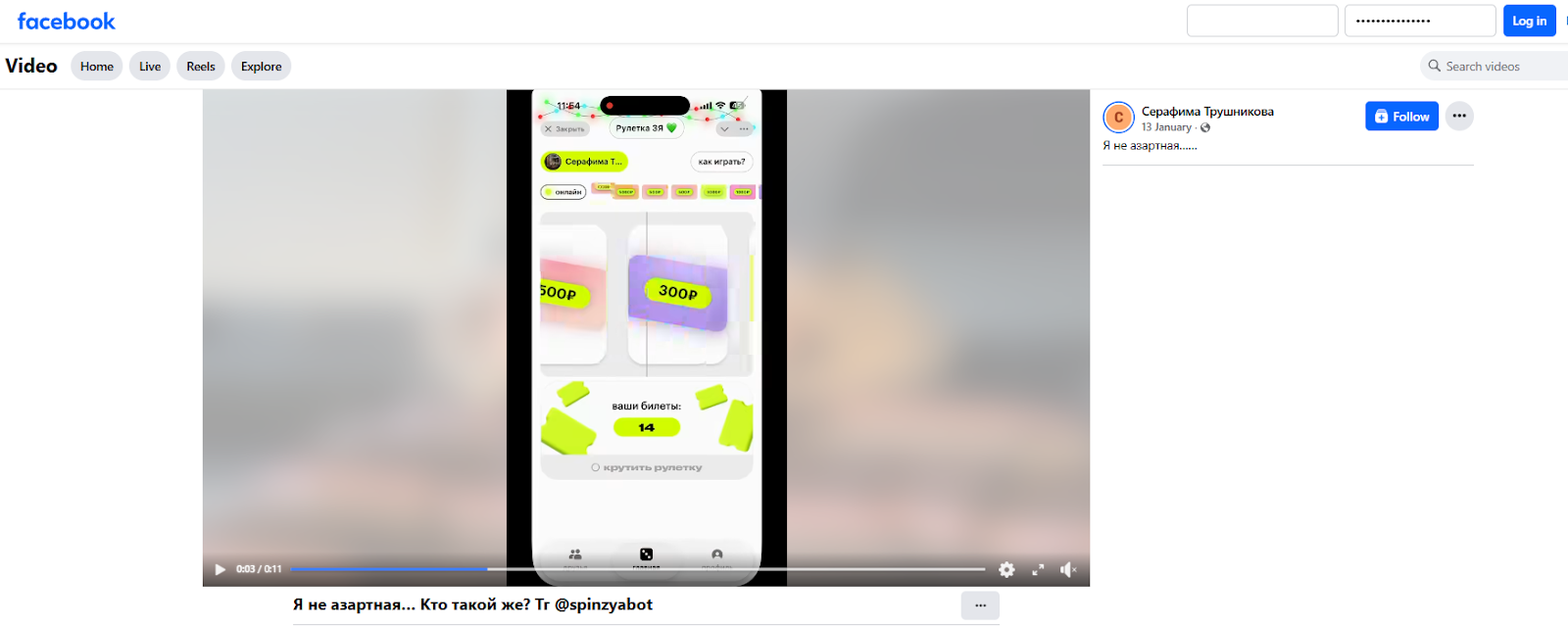 Найти реальные отзывы от пользователей бота Лаймовая Бьюти Рулетка Золотое Яблоко практически невозможно, комментарии в тг канале закрыты, а на тематических форумах нет никаких обсуждений проекта. Основной способ продвижения бота, это реклама в соцсетях, типа TikTok/FaceBook/Instagram. Например, в одном из промо роликов на FB девушка демонстрирует игру и призывает присоединиться. Подобная реклама нацелена на эмоции жадности, где зритель видит легкий выигрыш и тоже хочет получить халяву в телеграмм боте Бьюти Рулетка ЗЯ, однако в действительности такие видео часто являются частью обмана и маркетинговой схемы лохотрона.