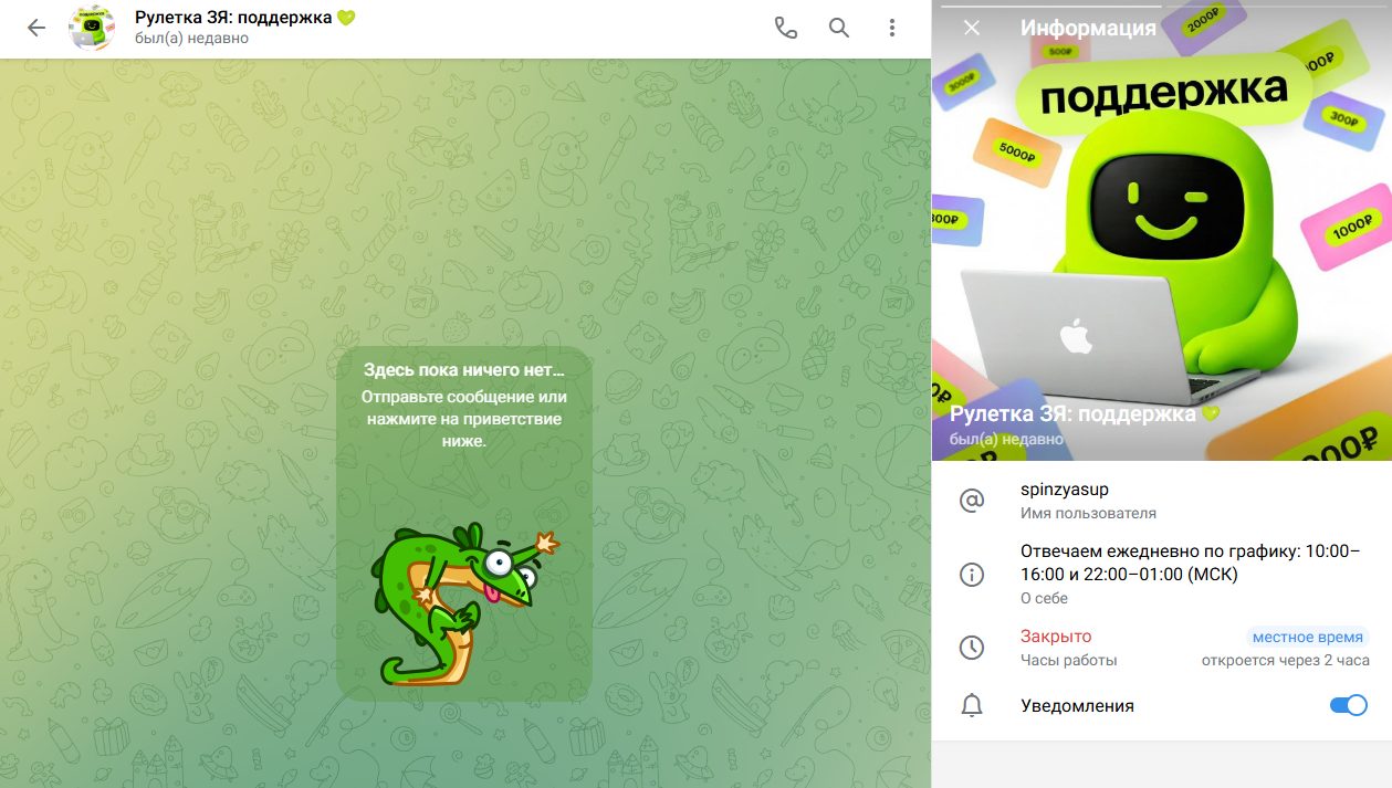 Вдобавок в сети нет никакой информации о юридическом лице: ИНН/официальной регистрации команда “Лаймовая Рулетка ЗЯ” в тг не предоставляет. Среди контактов для связи можно выделить лишь аккаунты в Telegram, техническая поддержка SpinzyaUp и менеджер по рекламе ManagerSpinzya. Поэтому в случае скама вы не сможете вернуть деньги, ведь вся ответственность остается на вас, привлечь организаторов не получится.