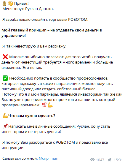 Мошенник убеждает подписчиков, что каждый желающий может получать большую прибыль от инвестиций без опыта, крупного капитала и больших затрат времени. Якобы торговый робот, которого разработал Руслан, всегда торгует в плюс и способен обеспечить любому инвестору стабильную доходность. Это звучит слишком «сладко», чтобы быть правдой.