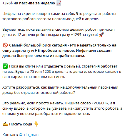 • Чтобы узнать стоимость «товара», клиент должен написать мошеннику в личные сообщения в Телеграм. Аферист может убедить доверчивого человека перевести ему деньги «за робота», а затем удалить переписку и заблокировать собеседника.
