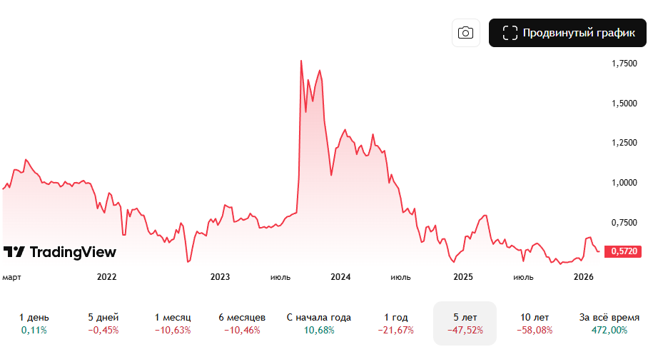 С момента выхода на рынок ценные бумаги принесли 472% прибыли. Это связано как с ростом валютной выручки, так и с падением курса национальной валюты. В последние 3 года акции показывают отрицательную динамику. Падение с пика почти в 2 рубля за акцию до 0.57.