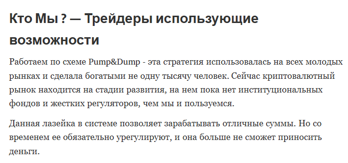 Эта мошенническая тема стара, как мир, но видно не все о ней знают. А я более проженный в этом плане. Как то уже попал, мне тоже говорили, что команда занимается ПАМПом, мол вносите депозит на наш счет, а мы его крутим. Тогда я поверил и отправил несколько тысяч. А выплаты мне не было. И этот канал работает для того, чтобы разводить народ.