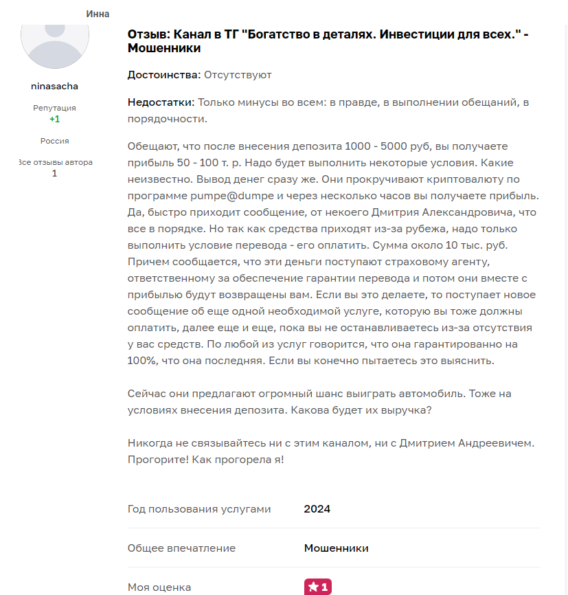 Положительных отзывов в сети нет. Те материалы, которые публикуются в самом канале – это фейковые скрины и купленные видеоролики, не содержащие реальных отчетов или кейсов клиентов.