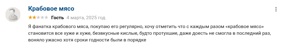 Если в продукции и не окажется червей или желатина, она может быть просто испорчена. В отзывах упоминается слабосоленая форель с запахом болота и земли, которая разваливается при нарезке. Крабовое мясо описывают как безвкусное, кислое и воняющее, будто протухшее. Даже морская капуста не обходится без сюрпризов – покупатели находят в ней толстые капроновые нитки и тряпки.