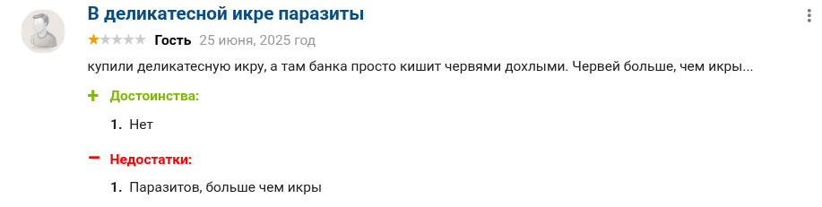 Другая частая претензия – подмена товара. Заказав дорогую лососевую икру, клиенты получают дешевую имитацию. Люди жалуются, что икринки сделаны из какого-то желе, не имеют вкуса и вида настоящей икры, называя это «чистым обманом» и «выброшенными деньгами».
