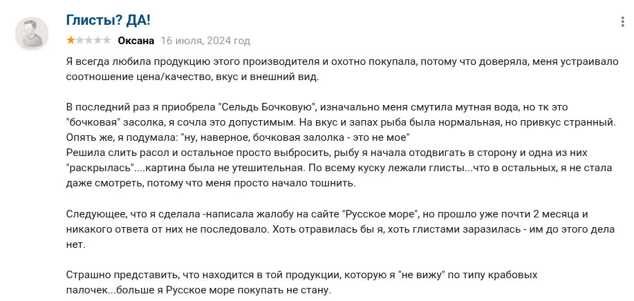 Один из самых вопиющих случаев – паразиты в продукции. Покупатели делятся фотографиями банок с деликатесной икрой, которые буквально кишат червями. Как пишут пострадавшие, «червей больше, чем икры», а банка просто набита дохлыми паразитами. Аналогичная ситуация с селедкой: при вскрытии рыбы люди обнаруживают глистов по всему куску, что вызывает рвотный рефлекс и желание немедленно выбросить покупку. Употребление такой «еды» может привести к серьезному отравлению или заражению.