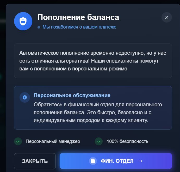Минимальная сумма для офферов составляет ₽1,000, а пополнить баланс предлагают с помощью банковских карт, по СБП или криптовалютой, но сделать это самостоятельно не получится, так как просят обратиться в финансовый отдел.