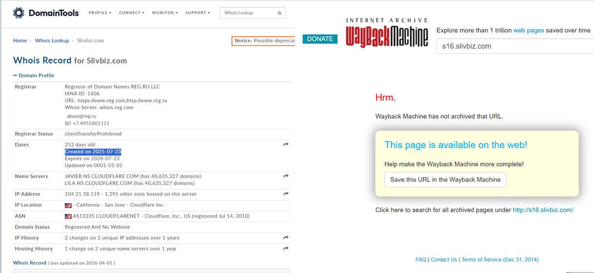 В карточке на сайте Whois написано, что домен портала SlivBiz com купили в июле 2025 года и на апрель 2026 ресурсу около года. В архивах сайта WaybackMachine нет информации о сервисе – ни одной страницы сайта в истории интернета.
