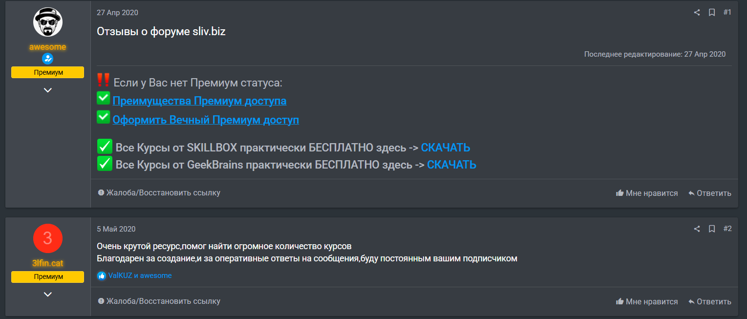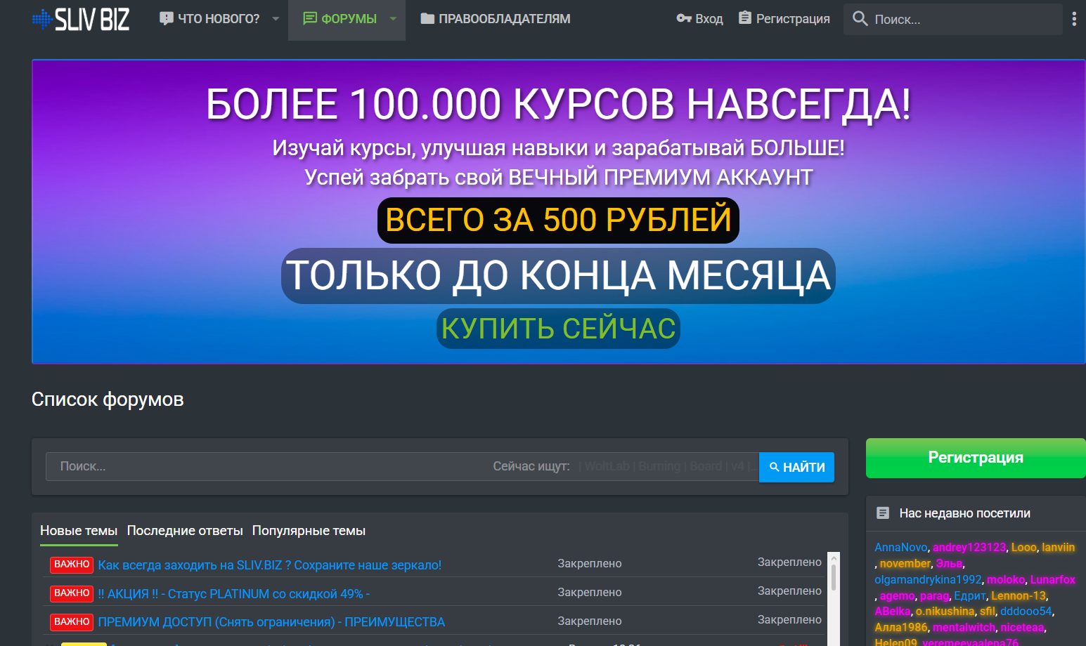На главной странице ресурса написано, что за ₽500 клиенты форума могут купить один из 100 000+ курсов, которые будут доступны для них «навсегда». Такая возможность открывается людям, которые приобретут на портале премиум-аккаунт. Выбор материалов на форуме большой – от программирования и дизайна до азартных игр и эзотерики.