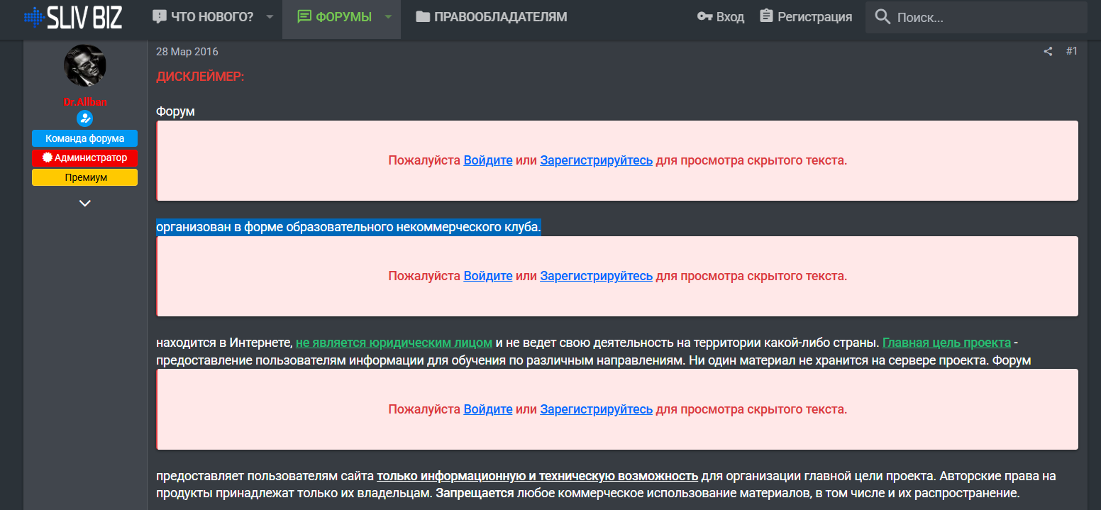 В разделе «Правообладателям» сказано, что форум основали как некоммерческий клуб, который деятельность не ведет и юрлица не имеет. Там же написано, что цель проекта – дать клиентам нужную для обучения информацию.