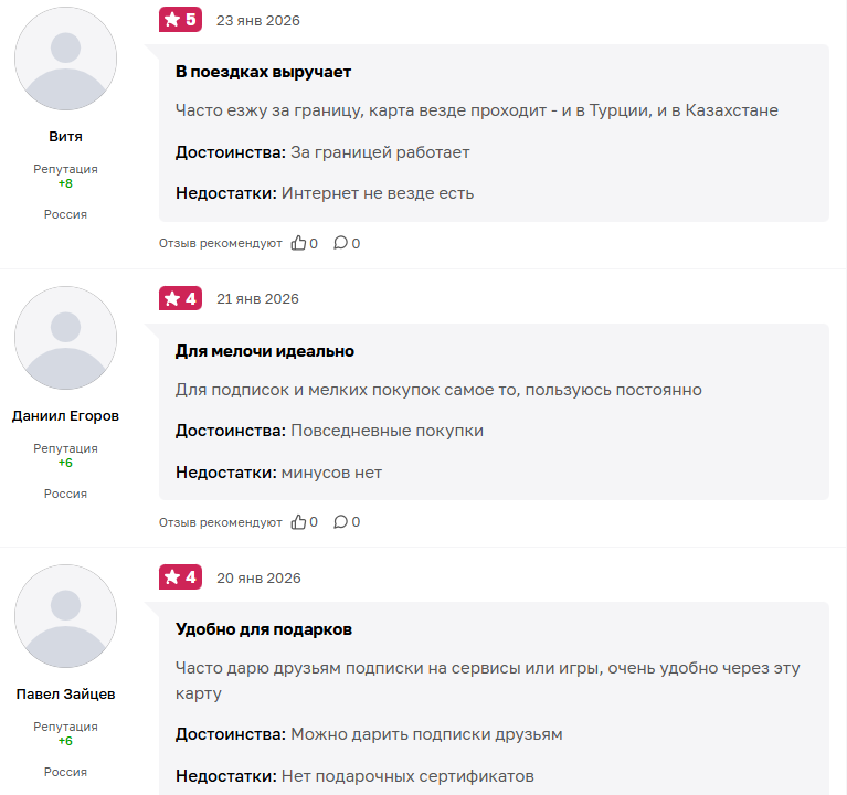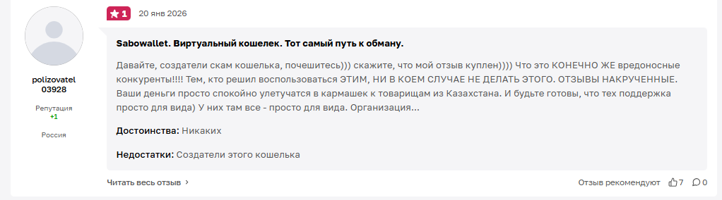 Анонимные основатели проекта уверяют, что им доверяют тысячи клиентов по всему СНГ, и в доказательство этому предлагают ознакомиться с положительными отзывами на сайте Otzovik. Довольные пользователи сообщают, что сервис якобы отлично работает за границей, подходит для повседневных покупок и пр. Отметим, что положительные комментарии опубликованы только здесь, на странице с отзывами, на которую ссылается сам SaboWallet.