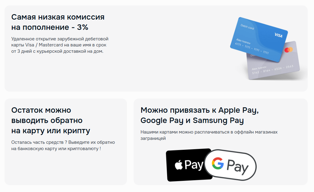 Карты Sabo Wallet проходят якобы во всех платежных системах, включая Stripe, Square и другие. Сервис обещает самые низкие комиссии на пополнение на рынке – 3%, а также разные способы внесения средств: