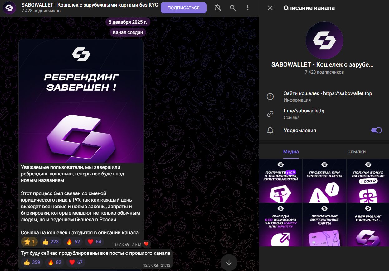 Проект ведет и полноценный публичный телеграмм-канал SaboWalletTg. Он был зарегистрирован 5 декабря 2025 года. Первый пост сообщает об успешном завершении ребрендинга, смене названия сервиса. Такая необходимость была якобы обусловлена сменой юридического лица в РФ. Никакие официальные документы, лицензии или постановления «SaboWallet | Кошелек с зарубежными картами без KYC» при этом не публикует.