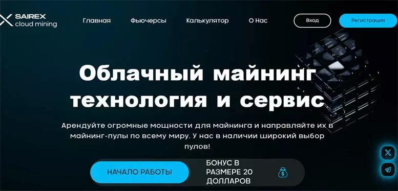 Площадка работала на домене sairex pro, он был создан 23 февраля 2025 года. Дизайн выглядел современно. Темный фон с синими акцентами. Крупный заголовок сразу объяснял концепцию – облачный майнинг и технология. Визуально все смотрелось профессионально.