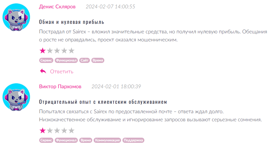На Trustpilot собрались исключительно негативные отзывы о Sairex. Клиенты делились горьким опытом. Главная проблема – невозможность вывести деньги. Схема работала только в одну сторону.